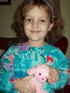 Yes, I know, I sew a lot for Keileigh, especially this time of year.It has become tradition that for every birthday the kids get a shirt or pajamas from mommy. This year Keileigh chose this fabric at Walmart all on her own. I pulled out the pajama patterns in her size and let her pick which one she wanted. She picked one that was a top and pants, but being worried that we didn't have enough fabric for that one, I used a diffferent one that called for lace and ribbon, so we went out to the garage and found some that matched perfectly. Once they were finished she had to put them on and wear them for that night and the next day too. It's a definite change in colors for what I usually make her, last year was pastel vegetables and hearts. She also has decided that pictures are a lot of fun if it is her idea.